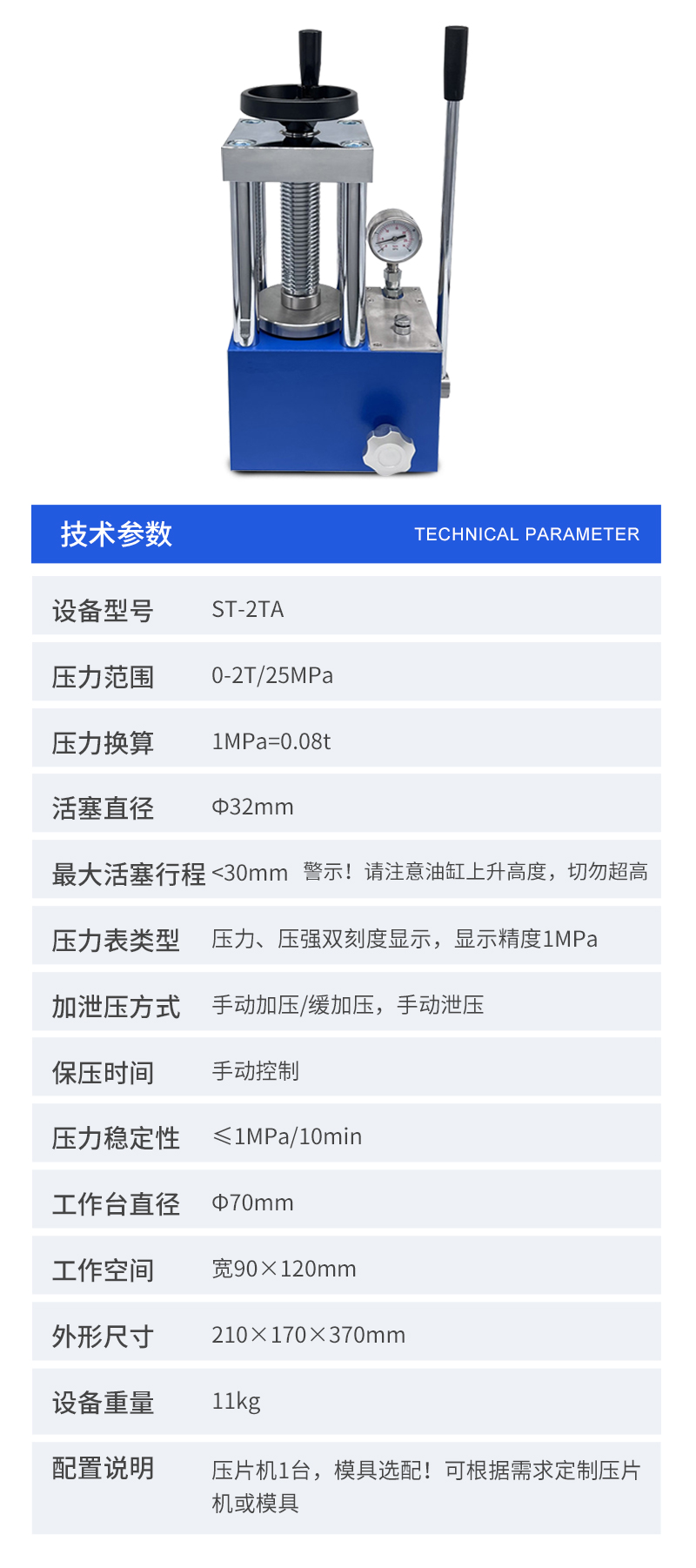 | 配置說明 | 壓片機1臺,模具選配,數顯表選配!可根據需求定制壓片機或模具 |