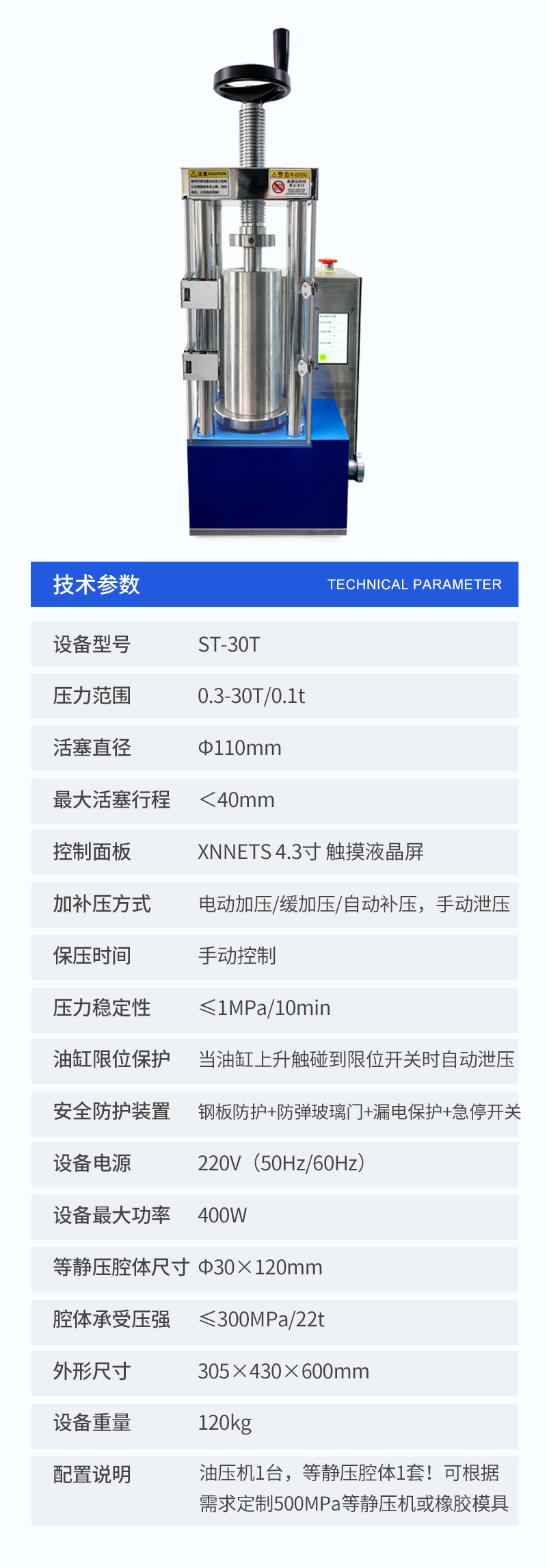 配置說明油壓機1臺,等靜壓腔體1套!可根據需求定制500MPa等靜壓機或橡膠模具