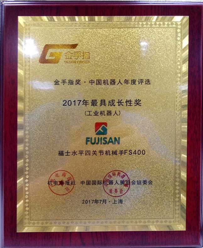 2017年7月5日,在上海虹橋西郊假日酒店舉行的“中國(guó)機(jī)器人年度金手指獎(jiǎng)”上,福士工業(yè)的水平四關(guān)節(jié)機(jī)械手憑借其高精度,高耐性,誤差小等優(yōu)質(zhì)性能榮獲“金手指獎(jiǎng)2017年最具成長(zhǎng)性獎(jiǎng)”。