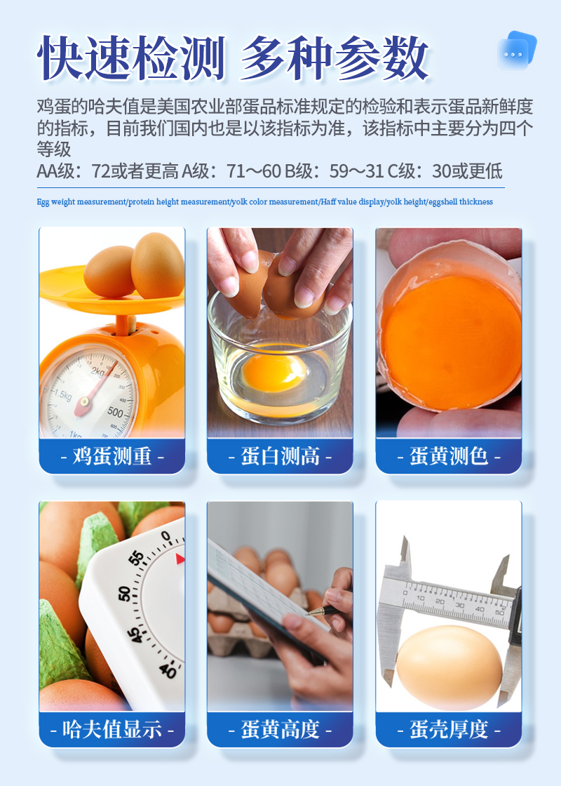 2.儀器采用智能化控制,可一鍵自動測量蛋重、蛋白高度、新鮮度(哈夫單位)、蛋黃高度、蛋殼厚度。