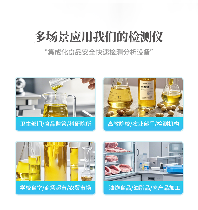 廣泛應用于質(zhì)量監(jiān)督檢驗、工商管理、油炸食品生產(chǎn)基地、食藥監(jiān)局、衛(wèi)生部門、肉制品食品深加工企業(yè)、商場超市、各大食品安全監(jiān)測系統(tǒng)等單位使用。
