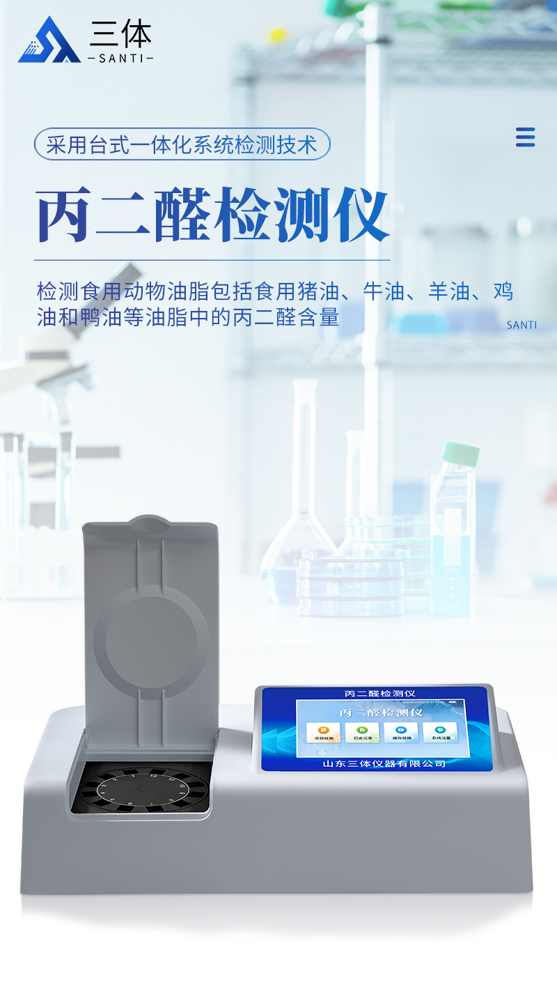 山東三體儀器有限公司生產(chǎn)的丙二醛檢測儀為集成化食品安全快速檢測分析設備,采用臺式一體化設計,能夠快速檢測食用動物油脂包括食用豬油、牛油、羊油、雞油和鴨油等油脂中的丙二醛含量;儀器預留其他項目檢測程序和端口,根據(jù)日后需求可進行遠程升級