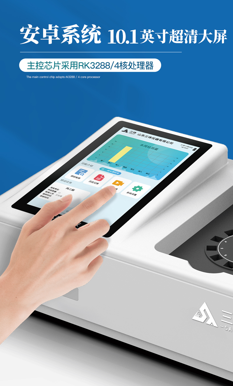 3、顯示屏幕:儀器采用10.1英寸豎向液晶觸摸屏顯,搭配運行安卓智能操作系統,主控芯片采用ARM Cortex-A7,RK3288/4核處理器,主頻1.88Ghz,操作方便,性能更強。